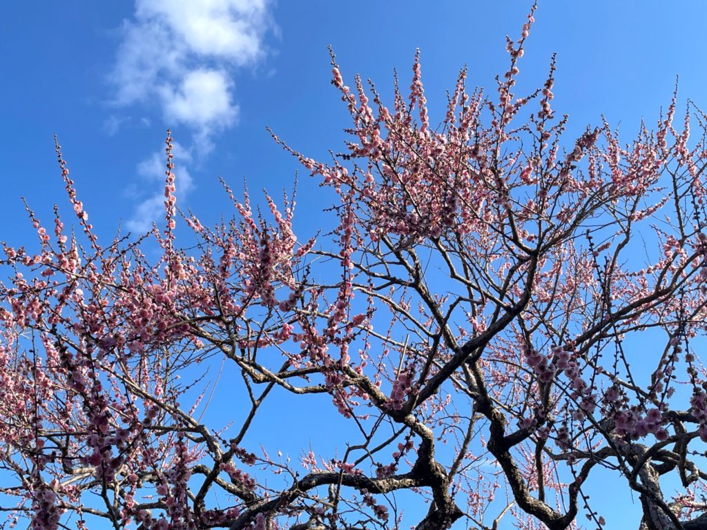 青空に、薄紅色の梅の花がよく映えますね✨