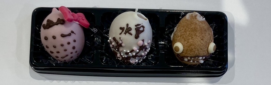左から、いちご🍓、水戸の偕楽園の梅🌸、アンコウ🐟です。